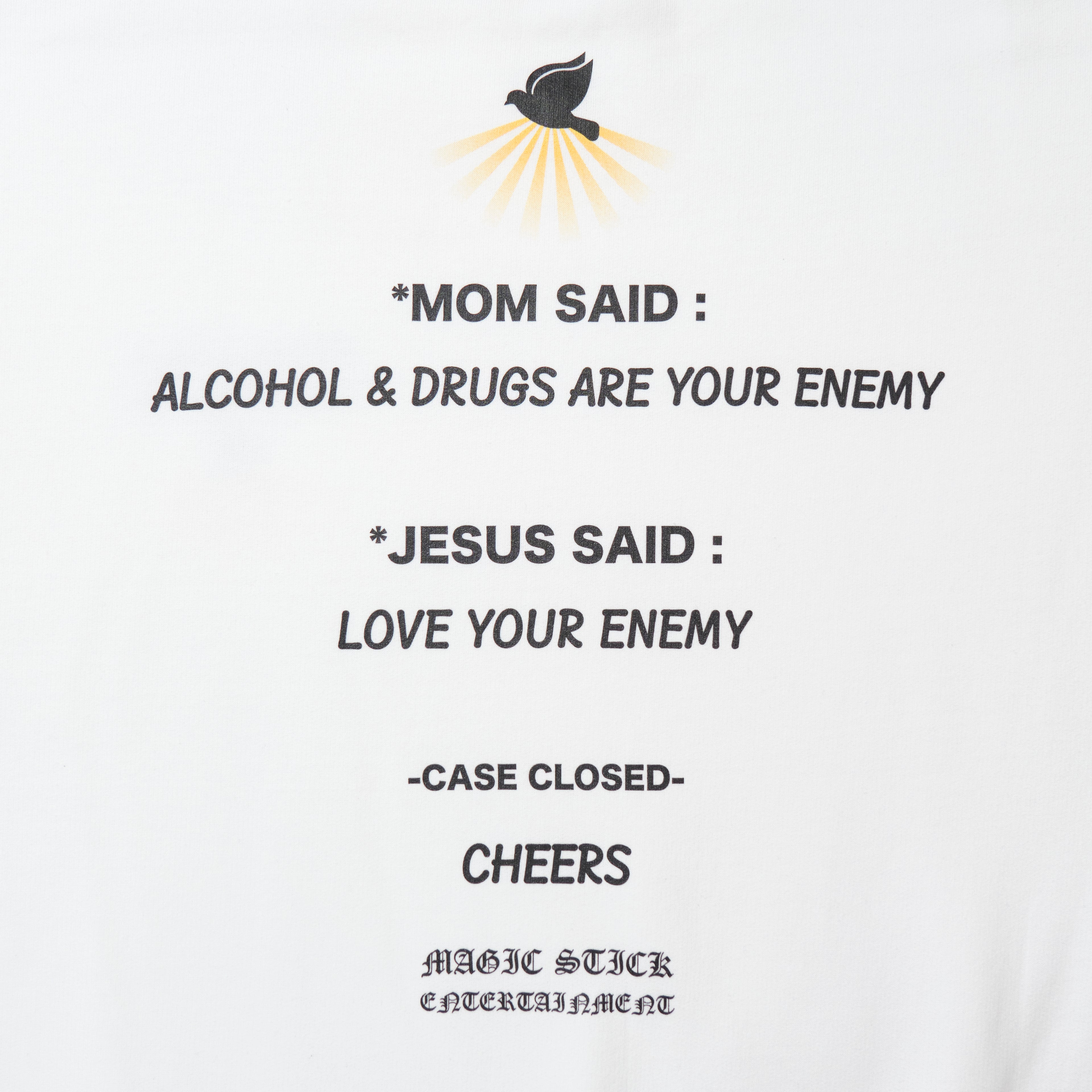 聖書のデザインをサンプリングし神の言う”敵を愛せよ”の意味をジョークに変えたブランドらしい遊びのデザイン。